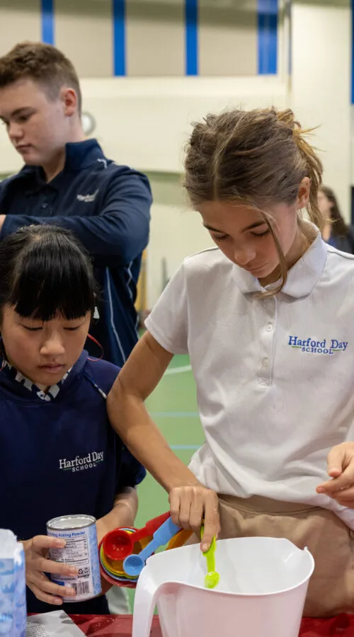 Visual and Performing Arts are integral to the Harford Day experience. All students are enrolled in music and visual art courses during their three years in Middle School, and sixth and seventh grade students also take a course in graphic design. Additionally, students can elect to participate in Chorale and Set Design, as well as theater performances in the fall (a play) and spring (a musical); those interested in contributing behind the scenes are able to become part of the tech crew. A particular point of pride is our Artist in Residence program, a tradition that brings a professional artist to campus each year to engage with students and make art! Gorgeous examples of the masterpieces generated during the Artist in Residence week are permanently displayed throughout the school. The Middle School’s “smARTs Week” allows students to explore mini-courses related to the Arts, and finally, private, after-school lessons are available to children interested in piano or stringed instruments.